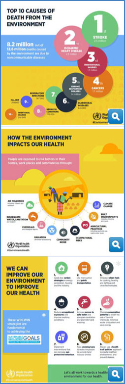 The World Health Organization (WHO) states that 23% of all global deaths are linked to the environment — that is approximately 12.6 million deaths a year. Of these, WHO reports that 8.2 million deaths from noncommunicable diseases such as stroke, heart disease and cancer are caused by exposure to harmful environmental conditions.
