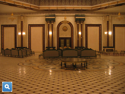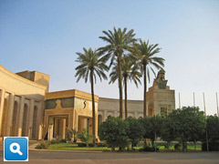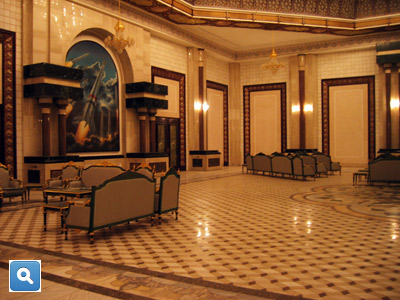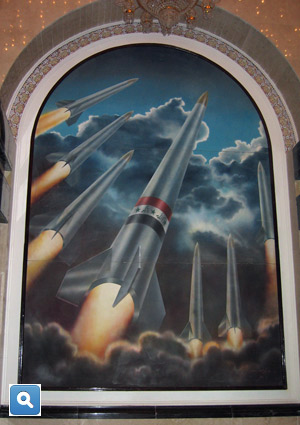 The palace was overwhelming. It was a gilded, marbled, frescoed, crystal-chandeliered display of a tyrant's self-indulgence. Other despots have venerated themselves with monuments of such extravagance, but few could have trumped Saddam. This Baghdad palace was as garish as a Vegas hotel and larger than most museums. One day, trapped inside by a sandstorm, we tried to measure the place and gave up, running out of time before we ran out of rooms. It had three levels, a huge rotunda, great rooms large enough for banquets seating hundreds. Marble covered the walls and the floors. In a large room on the first floor a massive painting depicted seven Iraqi missiles launching toward their target, which was said to be Israel.
