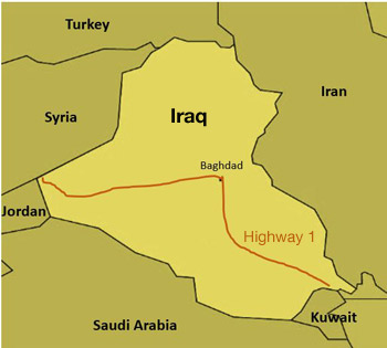Eighteen hours earlier, I had left Kuwait with several others — a U.S. State Department employee, a contractor and a few armed people, including a Navy Seal — in a three vehicle convoy heading north to Baghdad on Highway 1. Farm vehicles and passenger cars used the road, but mostly military trucks and Humvees traveled on the divided highway, the only real highway in the country. The 750-mile road starts south at the Kuwait border, passes through Baghdad, then turns west, stopping at the Jordanian border.