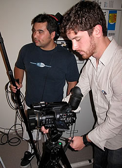 Zeldes concurs, “Michael was great, came completely prepared, and even did a few extra takes for me, which was nice of him since he's an established actor and I'm fresh out of film school.” Equipped with three lights, 10 feet of dolly track, and a digital camera, Zeldes got to work shooting the finely tuned script. “The hardest part of the filmmaking process,” says Zeldes, “is getting what is in your head onto the tape. In this particular instance the office had many bare white walls, so hiding the shadows was the most challenging part of lighting.” Eventually, Zeldes found the trick, bouncing the lights off the walls to create a soft light, and setting one final light spotted directly onto Michael, to make his eyes sparkle.