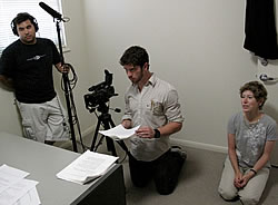 Zeldes’ friend and colleague, Brian Rudloff, did production sound on the shoot. He combated the sounds of passing lawnmowers and airplanes by placing the microphone just inches above the shot and spotting directly towards Michael’s mouth, resulting in a very clean recording. He, too, is a recent graduate of USC film school with an emphasis in sound design and an interest in interactive media and animation. The pair have worked on several films together, most recently a documentary about war reenactment called “Saturday Soldiers.”