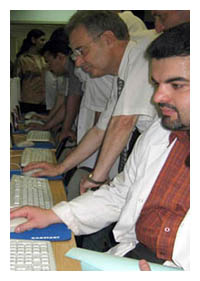 Physicians and medical students use computers following the dedication of the Medical Information Center at the Medical City Center in Iraq.