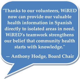 Volunteers translated modules focused on topics from nutrition to clean water to maternal and child health—the most important issues for the people of this region. WiRED Board Chair Anthony Hodge said, "Thanks to our volunteers, WiRED now can provide our valuable health information in Spanish directly to isolated areas in need. WiRED's teamwork strengthens our belief that community health starts with knowledge."